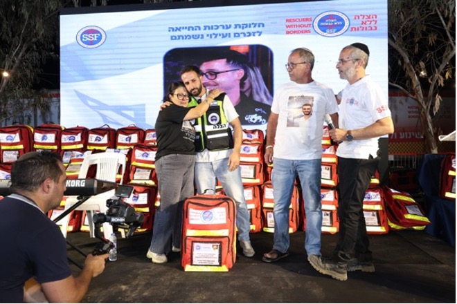 Une des missions de SSF est de créer dans le monde un large réseau de secouristes bénévoles formés et équipés. Depuis de nombreuses années, et en particulier depuis le 7 octobre 2023, des centaines de secouristes équipés par SSF en Israël se trouvent dans toutes les zones du pays pour assurer une protection civile, et stabiliser des blessés en cas de besoin. Nous avons poursuivi l’équipement de secouristes, mais en y intégrant un élément symbolique de la plus haute importance : fournir des kits de secours à la mémoire de chaque victime du Festival Nova, soit 366 victimes. Dans ce programme, conçu avec les familles, chaque kit de secours porte le nom et la photo d’une victime, une façon de rester présent dans les mémoires. Lors de la dernière distribution de kits Nova en septembre 2025, nous avons été honorés de la présence de Rachel Khan, marraine de ce programme, qui a délivré un message très fort, empreint d’humanité.